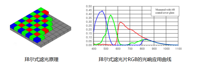 拜爾式成像色度計(jì)是采用彩色相機(jī)+算法的原理來進(jìn)行補(bǔ)償修正亮度和色坐標(biāo),其濾光片原理和光譜響應(yīng)曲線如下,