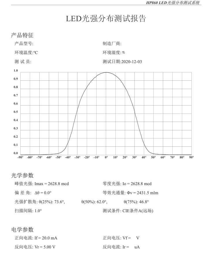 LED光強(qiáng)分布測試儀測試報告如下: