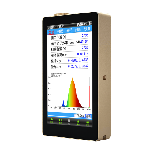 OHSP-350MUV光譜閃爍照度計(jì)是一款照明光源參數(shù)測量分析的專業(yè)設(shè)備。采用高速AMR 處理器與高精度電子CCD 光學(xué)傳感器,利用長焦交叉非對稱CT分光系統(tǒng)原理開發(fā)設(shè)計(jì),具有設(shè)計(jì)輕巧,性能穩(wěn)定,精確度高,性價(jià)比高便于攜帶等特點(diǎn),并配有5.0英寸高清電容觸摸顯示屏讓您像操作手機(jī)一樣熟悉自如。一鍵式操作, 一步即可完成測量,數(shù)據(jù)實(shí)時(shí)顯示,完全顛覆了老式高精度光譜分析儀巨大沉重操作繁瑣價(jià)格高昂等理念。配合PC軟件可對測試數(shù)據(jù)進(jìn)行高效的分析處理,具備極高的測量線性和準(zhǔn)確度。主要應(yīng)用于照明光源分析、監(jiān)控、研究等;也可應(yīng)用于家居、商場、學(xué)校、工廠、戶外等現(xiàn)場照明測量領(lǐng)域;還可用于光源產(chǎn)品的研發(fā)、產(chǎn)線質(zhì)量監(jiān)控等環(huán)節(jié)。